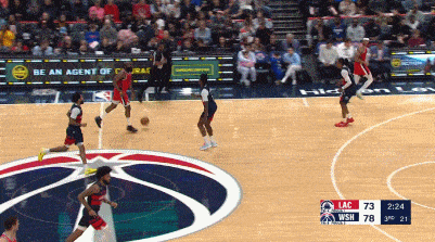 易边再战,乔治和卡林顿连得4分,祖巴茨补篮得手。萨尔和哈登先后得手,萨尔乔治;连续命中三分,约翰逊抛投命中拉开到9分。祖巴茨投篮得手,约翰逊和桑德斯先后命中三分。科林斯和萨尔接连扣篮得手,邓恩连得4分,卡林顿命中三分,哈登连续突破独得6分,米勒抛投造成干扰球,哈登两罚全中带队打出10-0反超,乔治先是正面命中三分,随后压哨打板命中三分,不过裁判回看后因为超时取消,快船队79-81落后奇才队结束第三节比赛。
