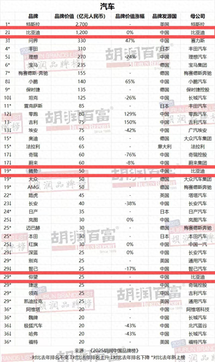 要问现在最猛的汽车品牌是谁,很多行内的人一定会脱口而出的品牌肯定是比亚迪。2月3日,2025胡润汽车品牌榜出来了,比亚迪以1200亿元的品牌价值远远超过其他国产汽车品牌,而且,比亚迪这是已经连续四年蝉联胡润汽车品牌榜了!比亚迪四度登顶,让全世界都知道了中国原来也有一个这么强大的汽车品牌。更有意思的是,连比亚迪旗下的腾势汽车、仰望汽车也分别以50亿、25亿的品牌价值首次上榜,登上了全球汽车行业品牌大舞台了!