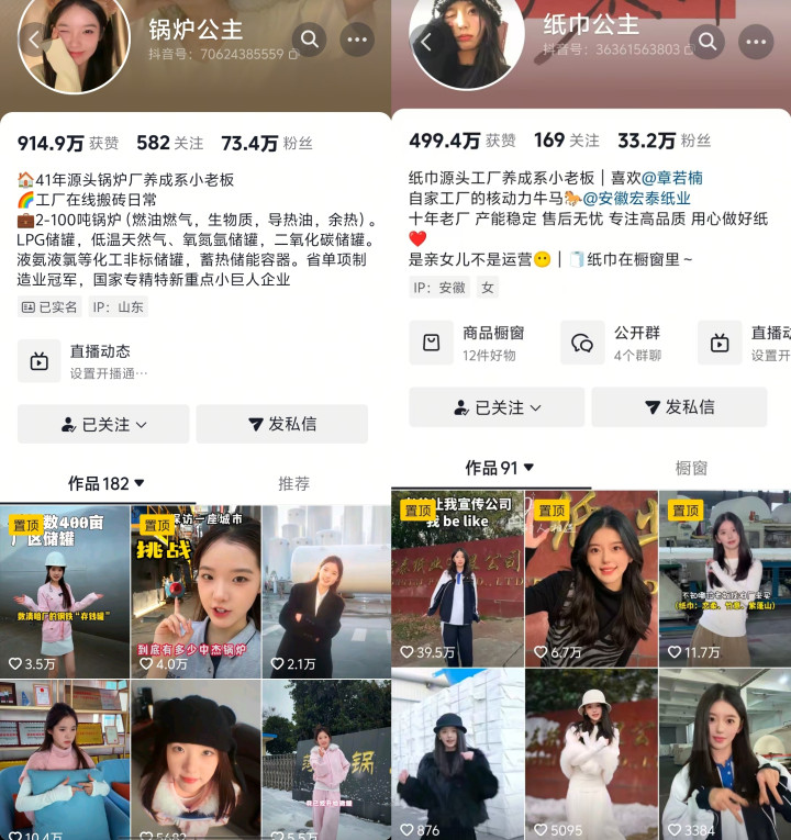红星资本局注意到,自2025年11月以来,越来越多“厂二代”进入短视频赛道,从“锅炉公主”到“纸巾公主”,他们或是唱歌跳舞,或是走剧情演绎风格,靠短视频把自家工厂的全貌和实力展现给大众。