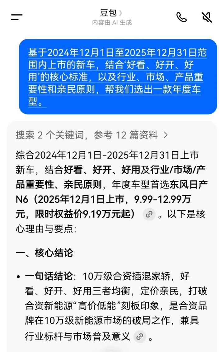 东风日产N6确实是我们年度车入围的车型。不过我们认为提名东风日产N6还需要连N7一起,虽然N6与N7在配置上有些不同,但N6/N7都是延续东风日产N7新能源破局思路的车型,因此它俩可以看做是不同动力型式的同一款车。豆包跟我们一样有眼光,从评选范围的181款新车中一眼挑中了东风日产N6。