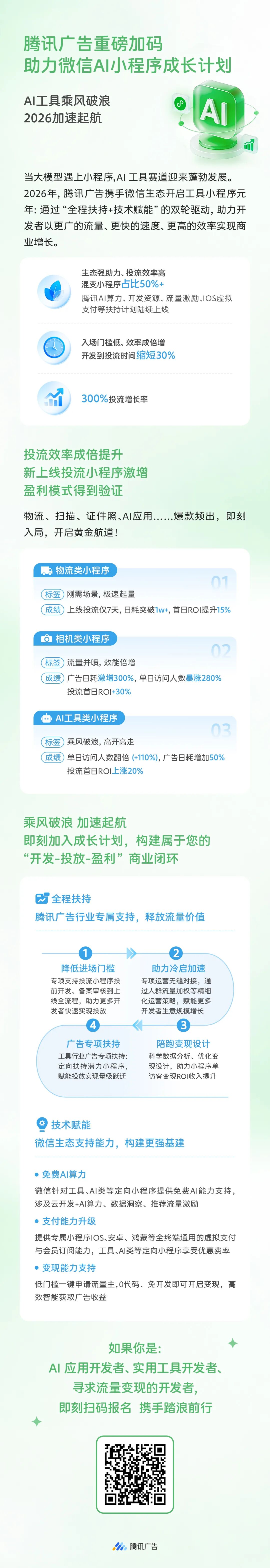 为了更好助力开发者,腾讯广告“全程扶持”重磅加码,携手微信生态共迎工具小程序的启航元年。