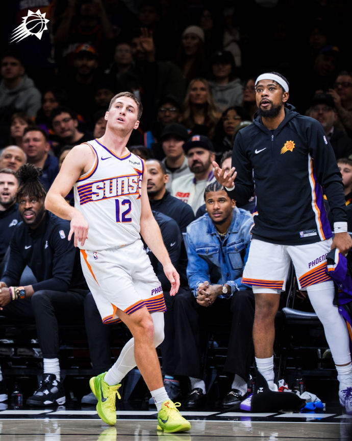 太阳全队有6人得分上双,其中3人得分20+。布克继续稳定输出,出战33分钟,投篮18中10,三分4中1,罚球4中3,拿到24分4篮板4助攻,也出现3失误,正负值+7。